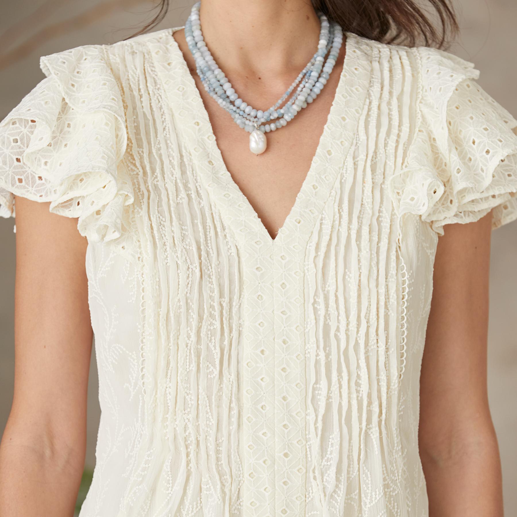 Allover tonal embroidery. flutter sleeves. pintuck details and lace panel enhance this ultrafeminine blouse. Fully lined. Polyester. Hand wash. Imported. Sizes XXS (00). XS (0-2). S (4-6). M (8-10). L (12-14). XL (16-18). Approx. 23.75l.