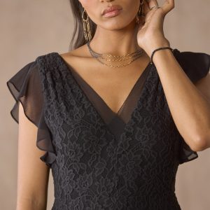 This beautiful. mesh lace dress has chiffon ruffle accents throughout and features ruffle feather sleeves. a v-neck front and back with eyelash trim and back zipper. Fully lined. Imported. Sizes XXS (00). XS (0-2). S (4-6). M (8-10). L (12-14). XL (16-18).