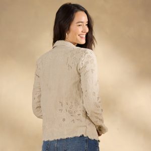 Meet the prettiest piece in your warm-weather wardrobe: Teresa! Shockingly versatile. this tailored lace jacket is a stunner dressed up. over a simple shift—or dressed down with your favorite jeans. All-over embroidered cutwork lace with raw scalloped hem. Welt pockets. Ramie. Machine wash. Imported. Exclusive. Sizes XS (0-2). S (4-6). M (8-10). L (12-14). XL (16-18). XXL (20-22). Approx. 23l.