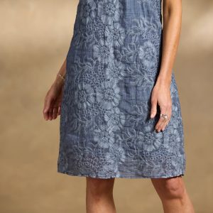 Easy and elegant. this flowing shift dress in vintage-inspired washed indigo is embellished with tonal floral embroidery. Fully lined. with keyhole button back. Ramie/Cotton. Hand wash. Imported. Sundance exclusive. Sizes XS (0?C2). S (4?C6). M (8?C10). L (12?C14). XL (16?C18). XXL (20?C22). Approx. 38.5l